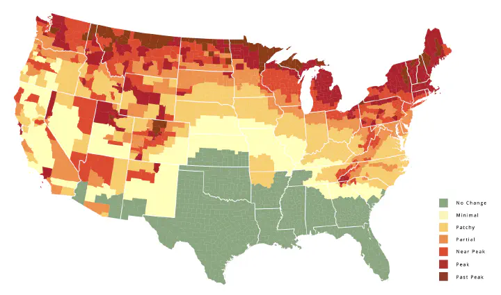 Note that you should use this map as a resource to predict the best time to see the leaf colors, but remember that it is not 100% accurate, as factors like seasonal weather conditions can affect the timing of this natural phenomenon.