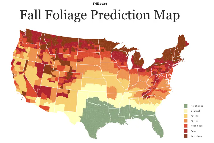 Note that you should use this map as a resource to predict the best time to see the leaf colors, but remember that it is not 100% accurate, as factors like seasonal weather conditions can affect the timing of this natural phenomenon.