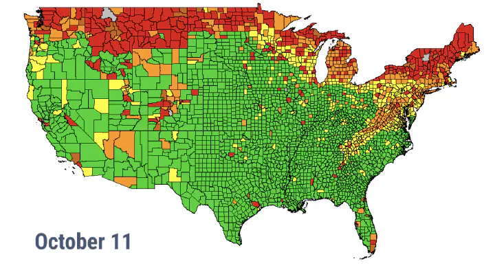 By October 9, parts of Maine, Vermont, New Hampshire, New York, Massachusetts, Michigan, Montana, and Washington will be at peak fall foliage.