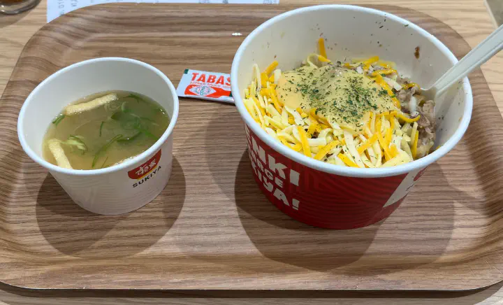 A nice bowl of three-cheese topped gyudon and miso soup at Sukiya.