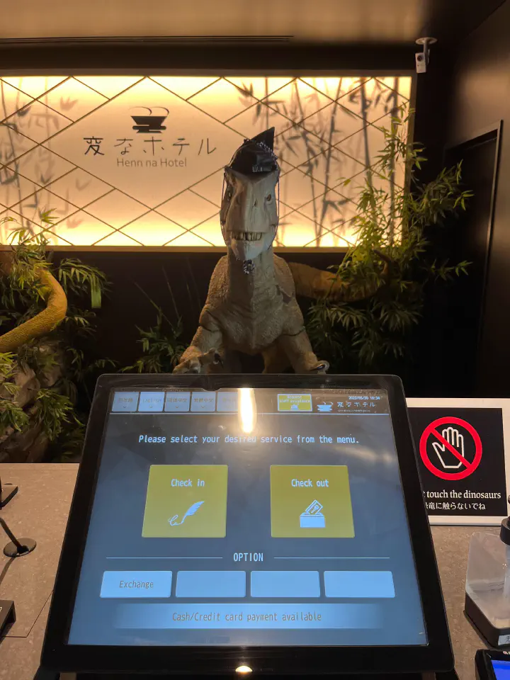 A friendly robot dinosaur welcomes guests at the Henn na Tokyo Nishikasai.